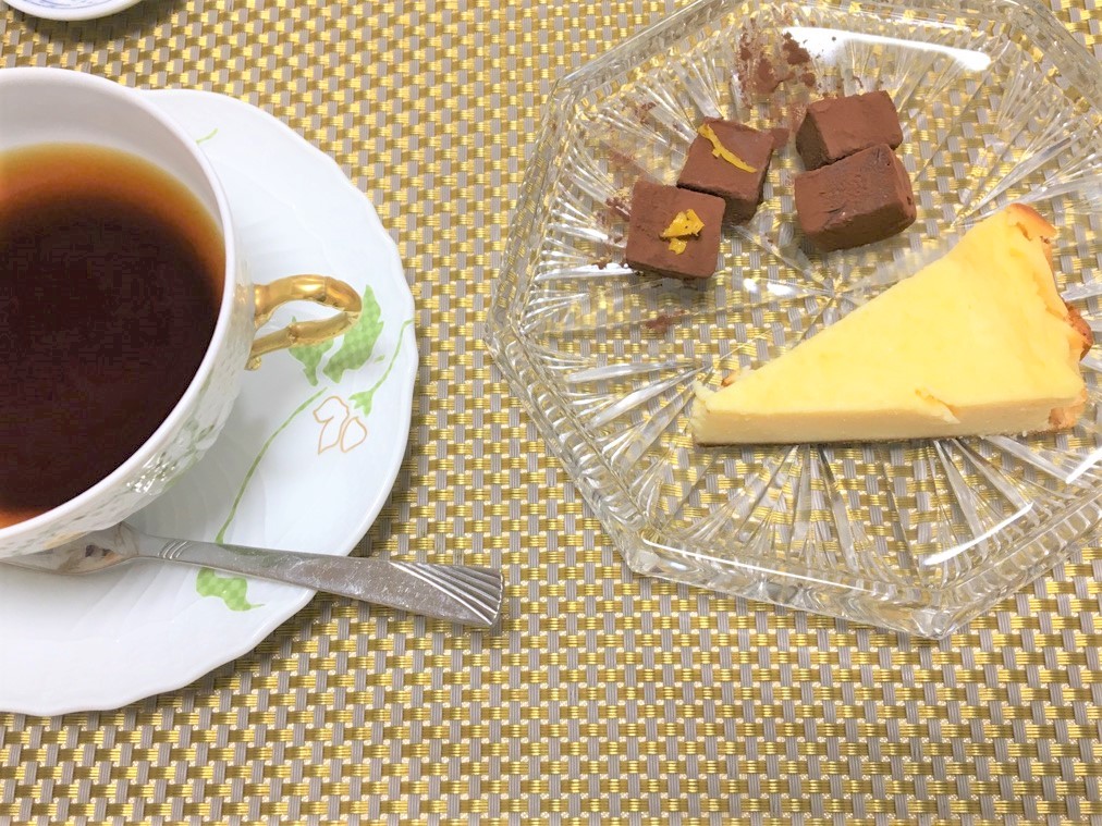 デザートに、柔らか米粉チーズケーキと生チョコ2種をお皿に盛り付け、
