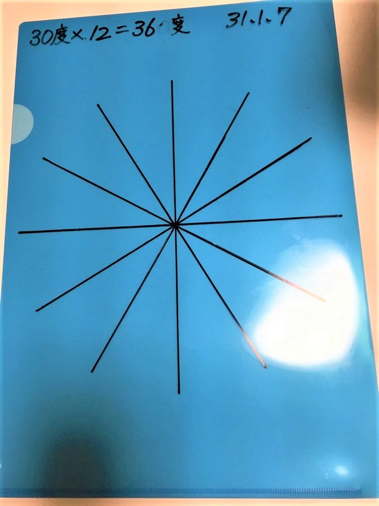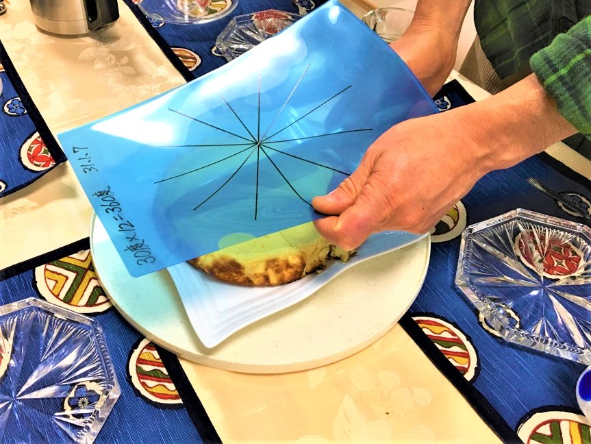 ケーキの上から等分に書いたファイルをかざして、それに合わせて切りましたら、