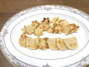 5.中ボウルに取り出す。手でよくこねて、クッキングシートの上に5ミリ位の厚さに伸ばし、好みの型を抜く。余った分はまたこねて伸ばし方を抜きます。