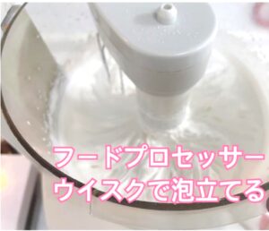 2.フードプロセッサーにウイスクをセットし、豆乳生クリームとオーガニックシュガー大1いれてふたをし、泡立てる。