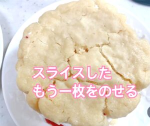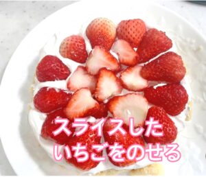 3.スポンジケーキをよく冷まして横にスライスしホィップを塗りいちごのスライスをのせ、