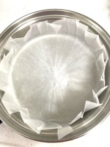 3.クッキングシートを折り曲げて中フライパンの高さの部分に切り込みを入れて敷いておく