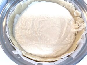 4.2のタルト生地を3の真ん中に置いて、押さえながら広げていく。