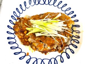 6.皿に取り出し、滋賀ネギをトッピング。